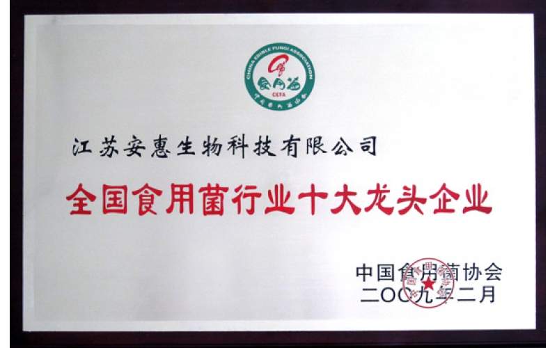 2009年2月25日,在中國食用菌協(xié)會第四屆第四次常務(wù)理事(擴(kuò)大)會議上,安惠公司被授予“全國食用菌行業(yè)十大龍頭企業(yè)”稱號。