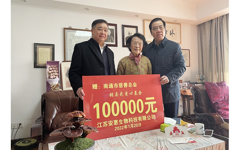2022年1月20日,安惠公司董事長(zhǎng)陳惠、南通市慈善總會(huì)副會(huì)長(zhǎng)葉沈良來到張柔武老人家中,通過安惠健康公益基金向張柔武愛心基金捐贈(zèng)10萬元,助力“情暖江海”春節(jié)慰問活動(dòng)。